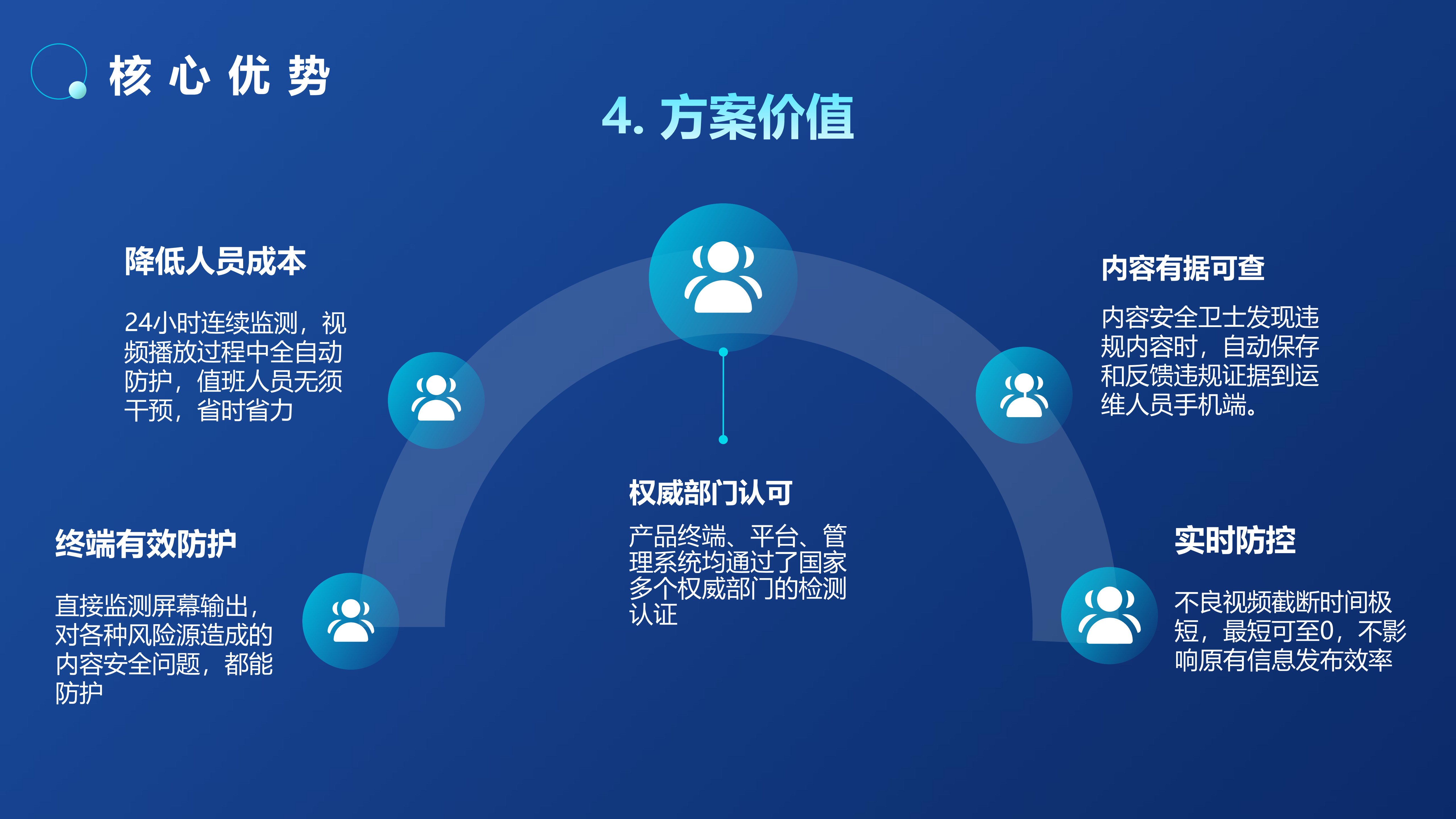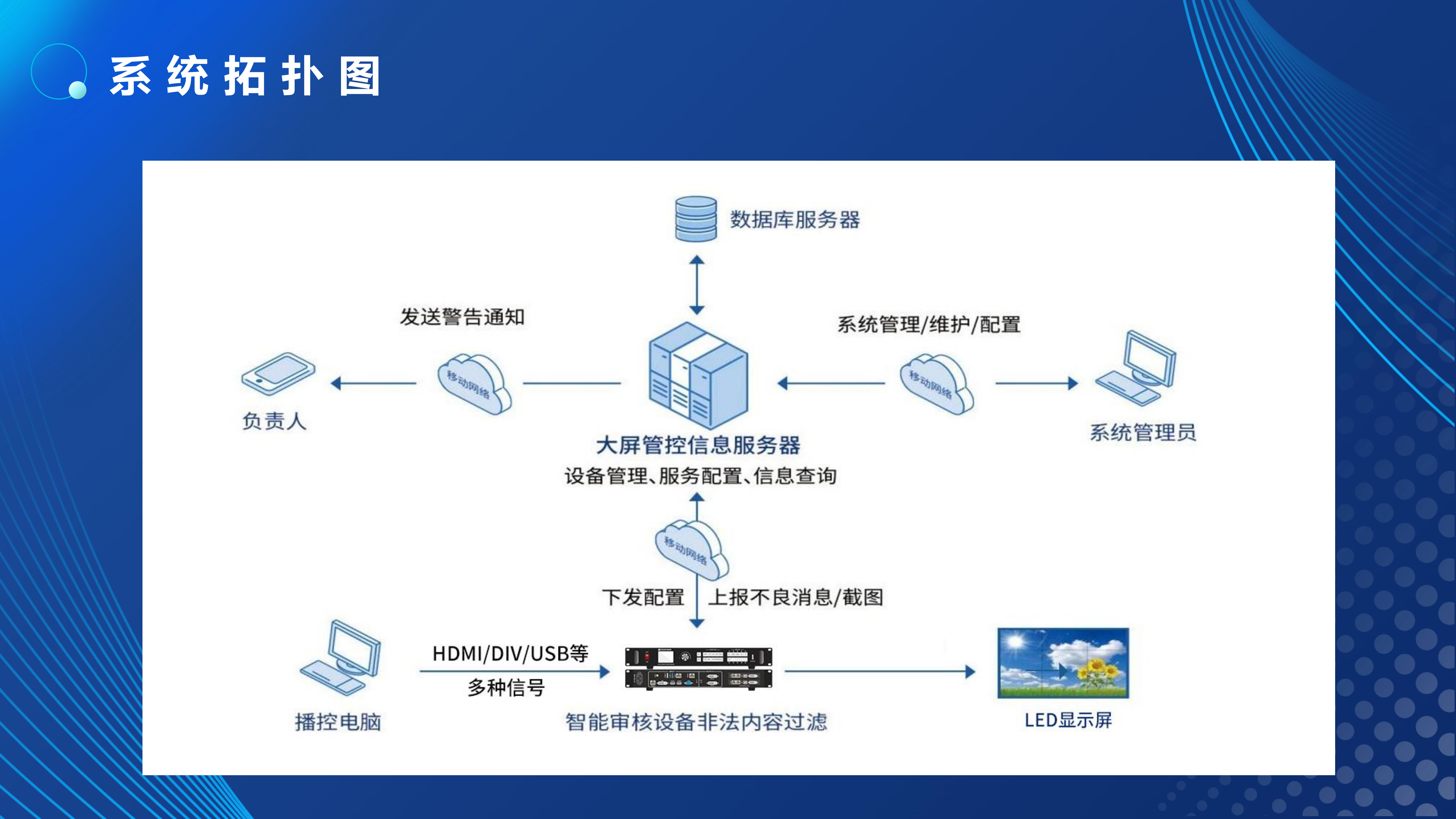 全国各地已经发生多起LED显示屏内容显示安全事故,造成恶劣的社会影响。内容安全事故根源大多是“操作不当、黑客攻击、蓄意恶搞”等原因播放色情、反动等不良视频。针对此情况,我司推出了LED大屏内容安全AI审核过滤服务器,该系列产品可对公共显示屏出现的涉黄、涉暴、涉恐等不良/敏感内容进行审核处置,更精准、更高效地解决视频内容的审核工作,以技术手段实现对公共显示屏的事前审核、事中控制、事后取证的全周期防护,在内容传输到播控屏幕的最后一环对内容进行严格把控,以人工智能技术为公共显示屏内容安全领域保驾护航。