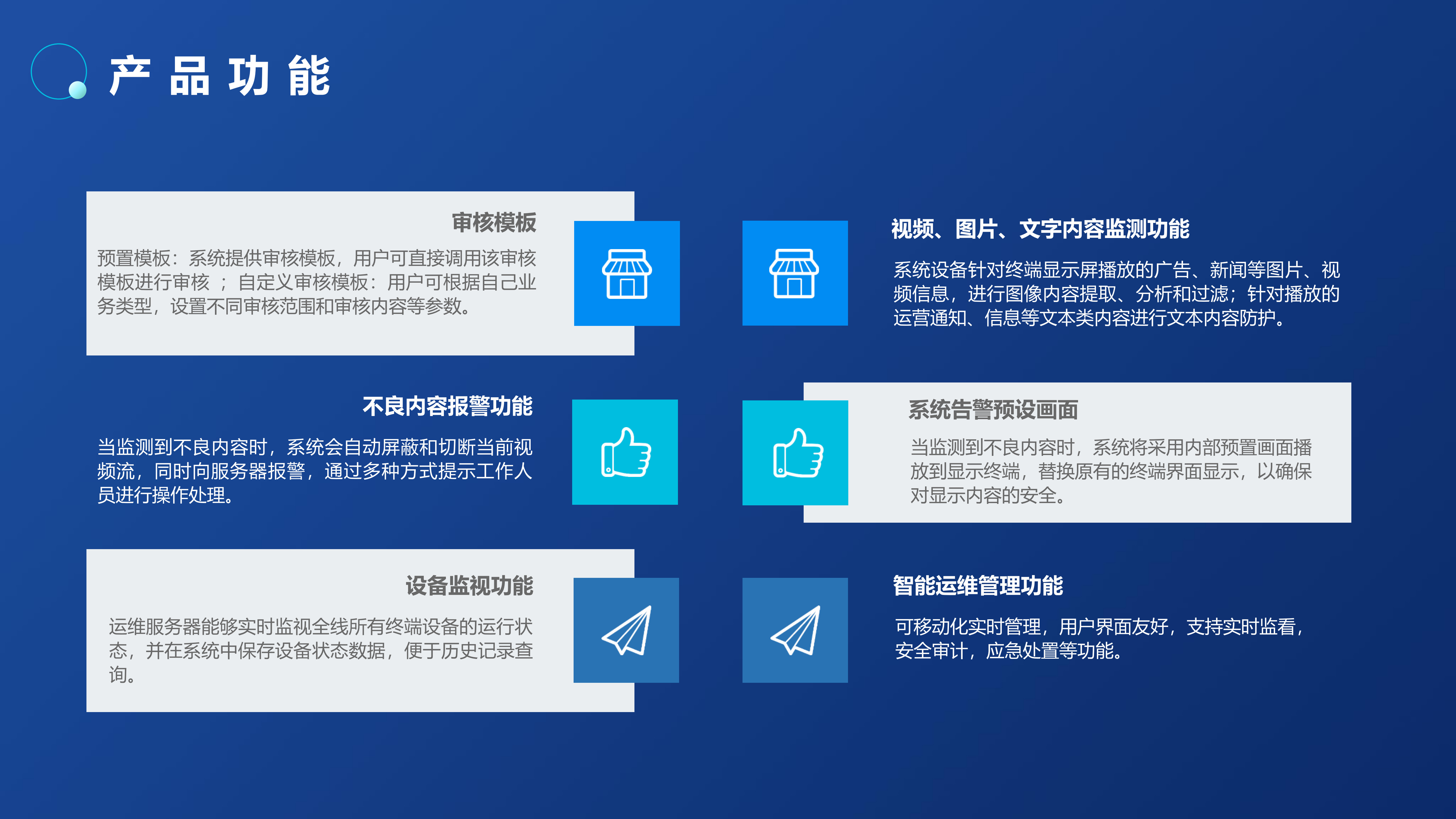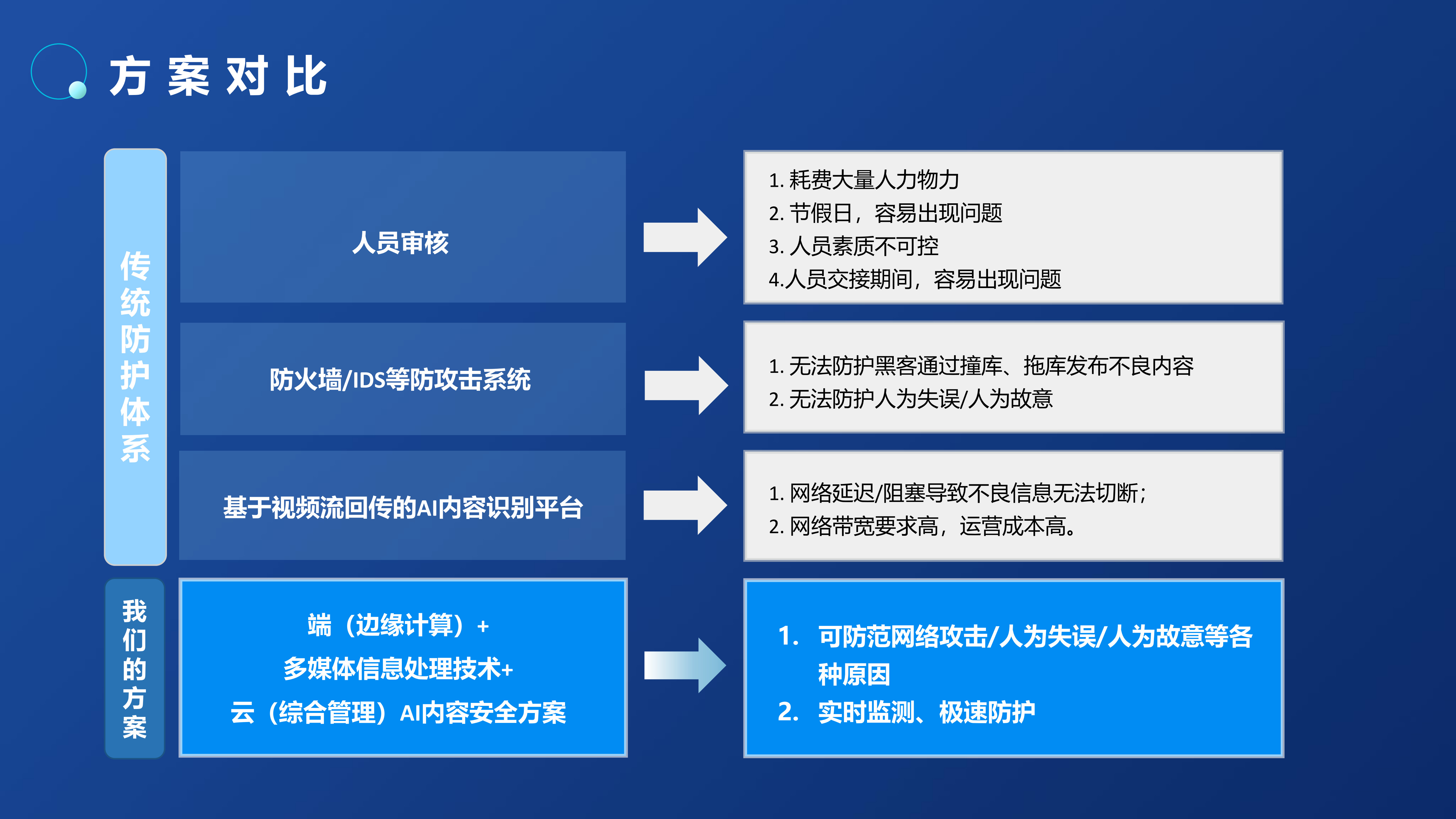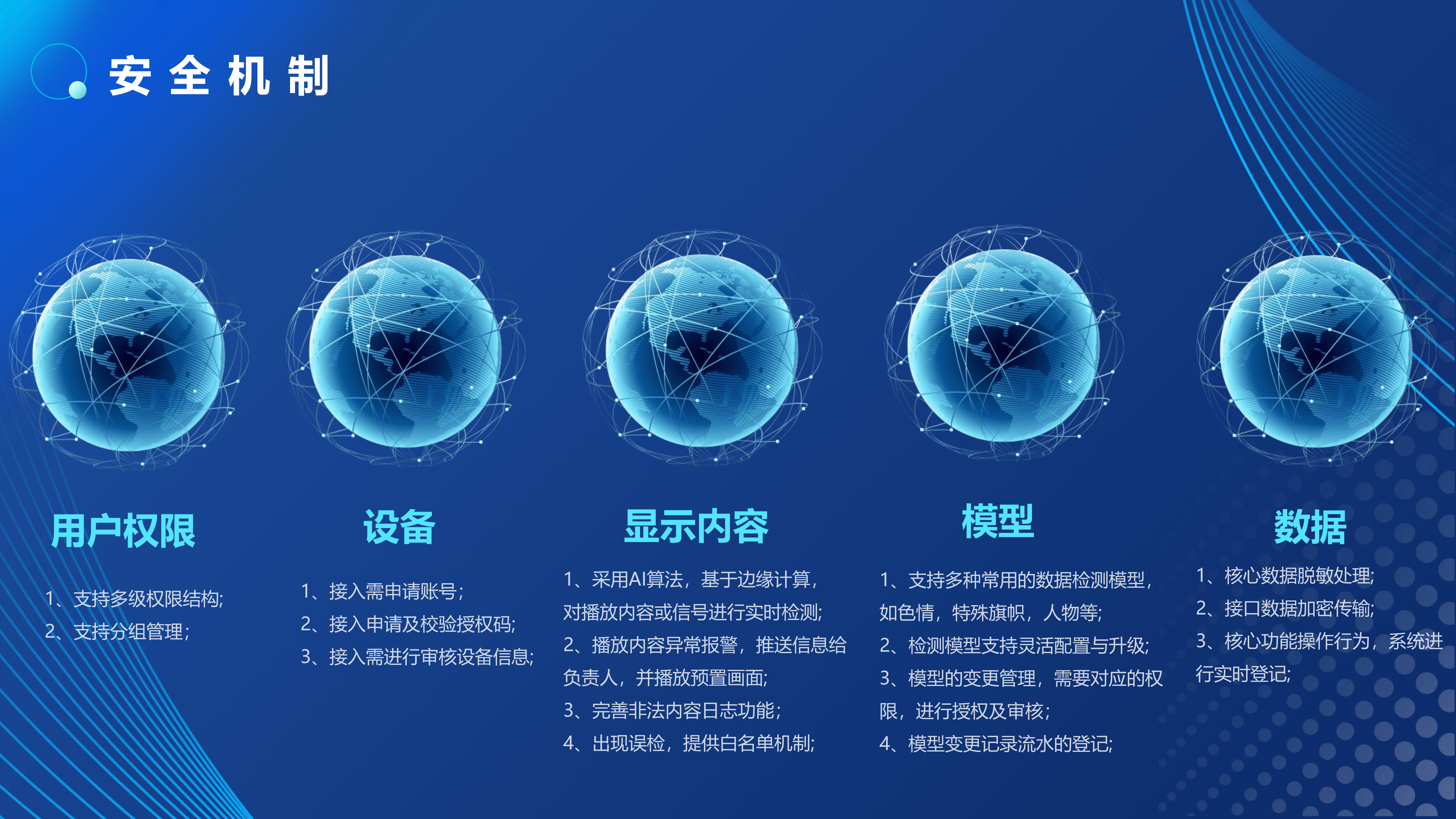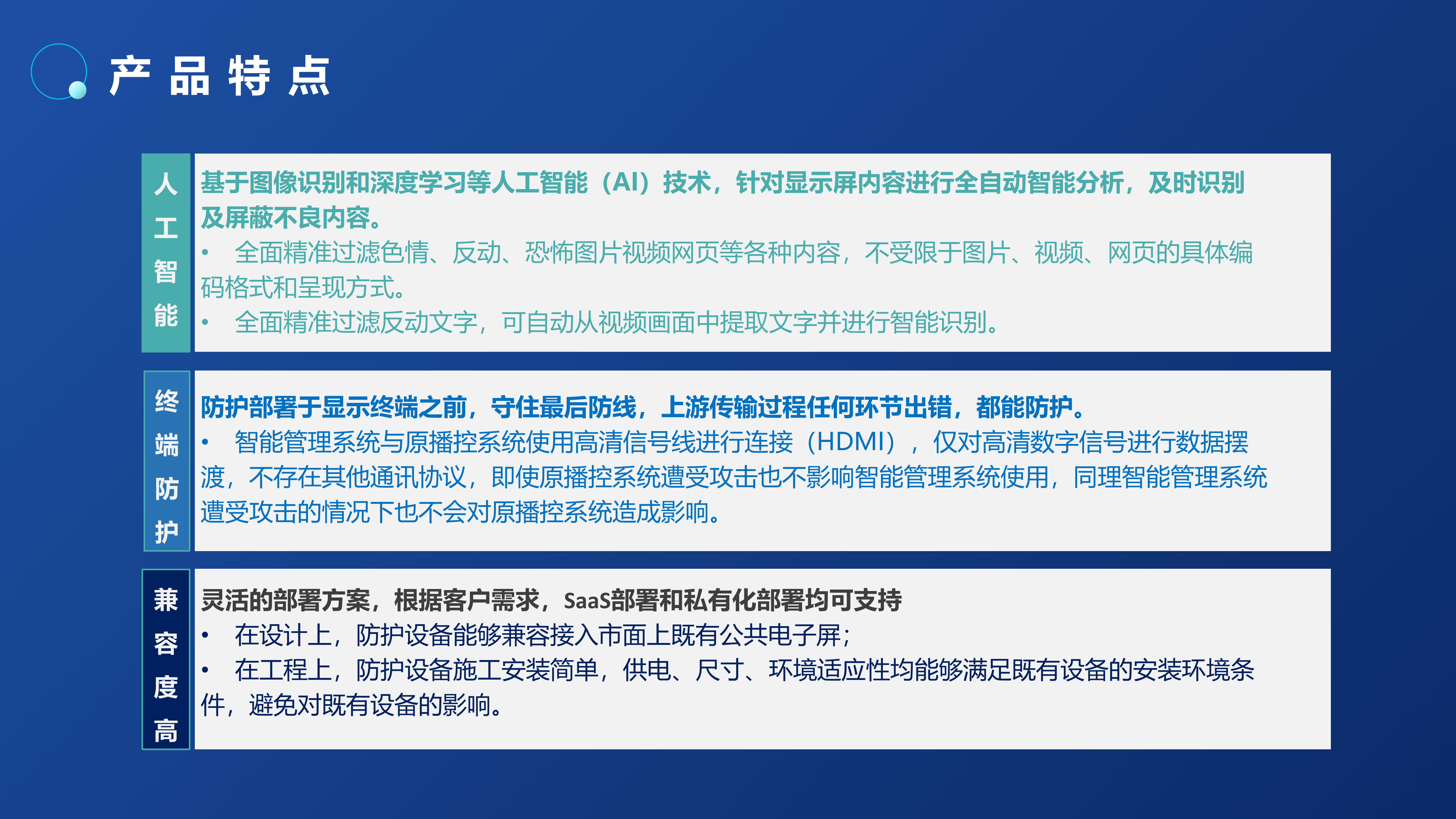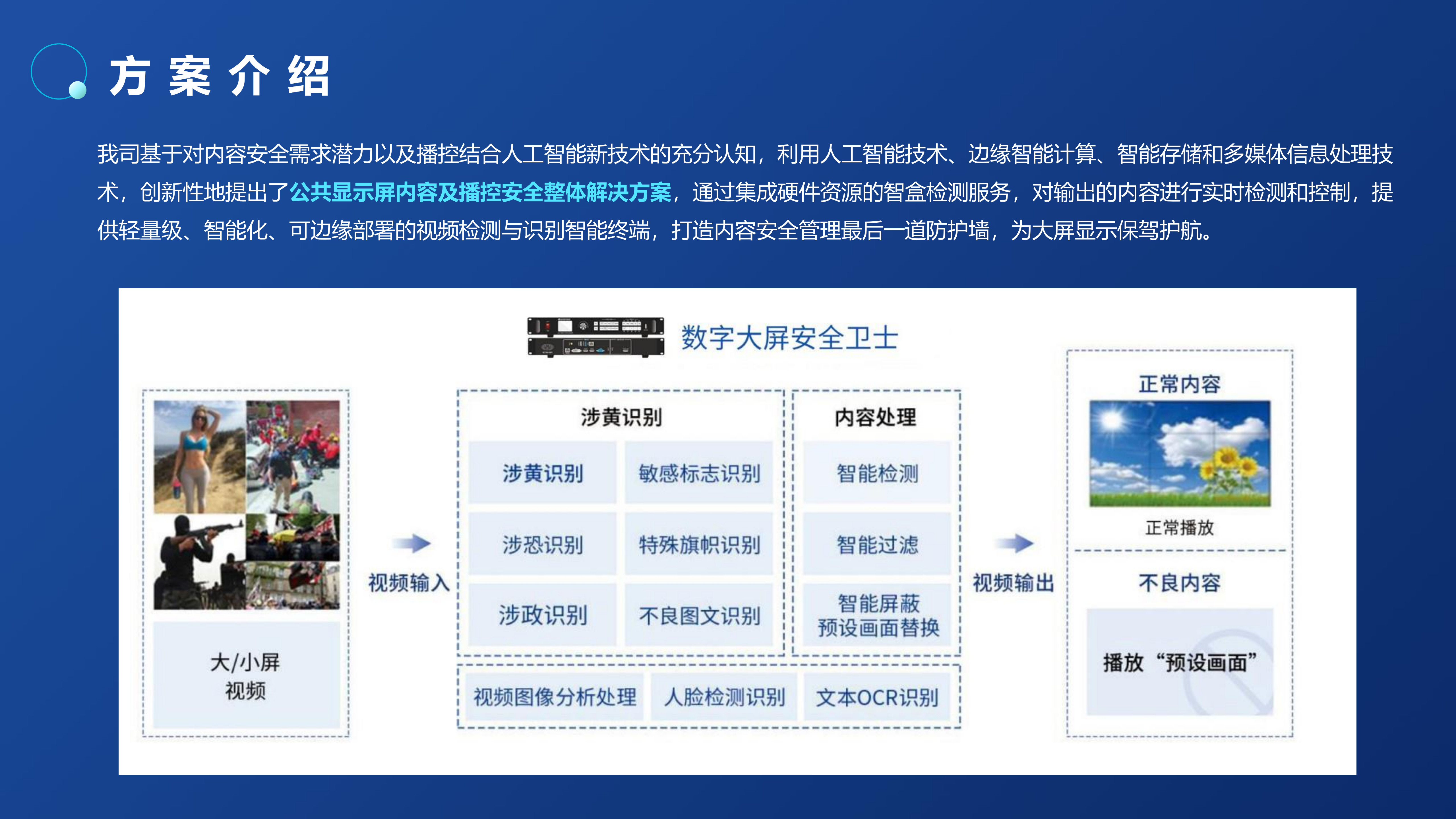 全国各地已经发生多起LED显示屏内容显示安全事故,造成恶劣的社会影响。内容安全事故根源大多是“操作不当、黑客攻击、蓄意恶搞”等原因播放色情、反动等不良视频。针对此情况,我司推出了LED大屏内容安全AI审核过滤服务器,该系列产品可对公共显示屏出现的涉黄、涉暴、涉恐等不良/敏感内容进行审核处置,更精准、更高效地解决视频内容的审核工作,以技术手段实现对公共显示屏的事前审核、事中控制、事后取证的全周期防护,在内容传输到播控屏幕的最后一环对内容进行严格把控,以人工智能技术为公共显示屏内容安全领域保驾护航。